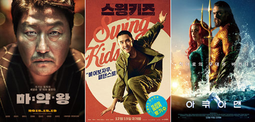 영화 ‘마약왕’ - ‘스윙키즈’ - ‘아쿠아맨’(왼쪽부터). 사진제공|쇼박스·NEW·워너 브러더스 코리아