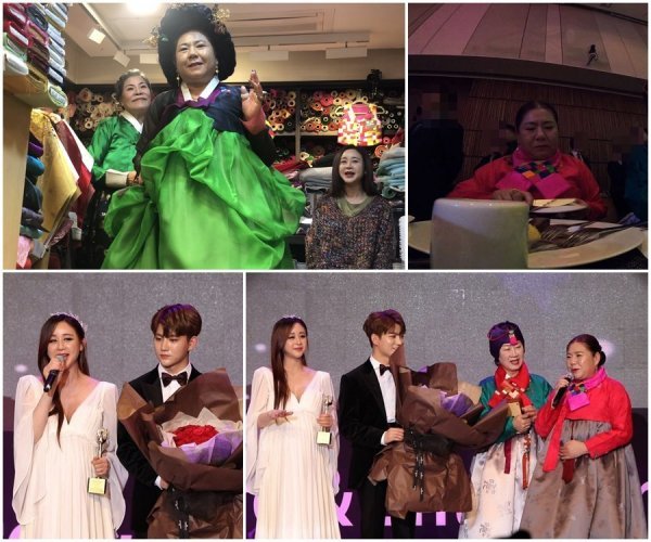 뒤이어 우아한 드레스를 입은 함소원, 멋진 턱시도로 한껏 꾸민 진화, 비녀부터 가락지 등 완벽한 한복 풀세트를 차려입은 두 어머니들은 ‘시상식장 포토월’에 입성했고, 두근두근하는 마음으로 기자들 앞에서 함께 포즈를 취하며 대경사의 기쁨을 마음껏 만끽했다. 더욱이 대기실에 도착한 함진패밀리는 시아버지의 ‘깜짝 선물’을 접한 후 영상통화를 하며 기쁨을 나눴던 터. 이때 한복 입은 시어머니를 처음 본 시아버지가 예상 못한 반응을 보여 패널들의 웃음을 유발했다.