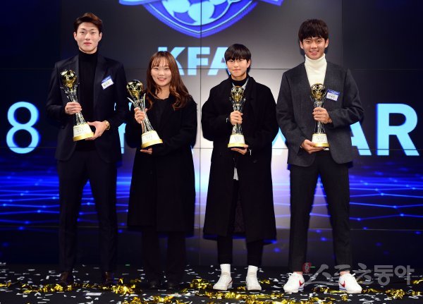 올해의 선수상을 수상한 황의조(감바 오사카)와 장슬기(인천 현대제철), 올해의 영플레이어상을 수상한 조미진(울산 현대고), 전세진(수원)이 카메라를 향해 포즈를 취하고 있다.