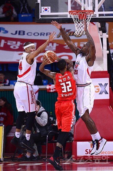 울산 현대모비스 문태종(왼쪽)과 라건아(오른쪽)가 18일 잠실학생체육관에서 열린 서울 SK와의 경기에서 애런 헤인즈의 공격을 함께 막아내고 있다. 현대모비스는 SK에 낙승을 거두고 이번 시즌 13연승을 기록하며 단일 시즌 팀 최다연승 타이를 기록했다. 잠실|김종원 기자 won@donga.com