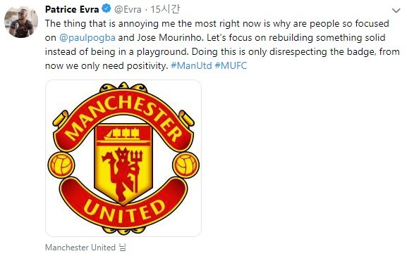 그러자 에브라는 자신의 SNS에 “지금 현재 날 짜증나게 하는 것은 사람들이 왜 폴 포그바와 주제 무리뉴에게만 집중하느냐는 것이다. 놀이터에서처럼 구는 대신 단단하게 재건하는 것에 집중해야 한다. 이런 식의 행동은 맨유의 뱃지를 무시하는 것이다. 지금부터 우리에게 필요한 것은 오직 긍정뿐”이라고 적었다.