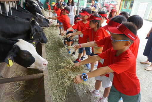 한국얀센 임직원 자녀들이 자녀 초청 행사인 ‘Childcare CAMP’의 프로그램으로 목장체험을 진행하고 있다.