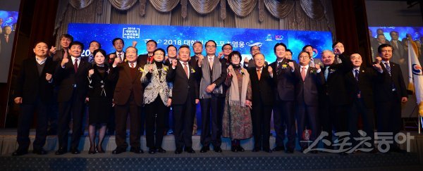 ‘2018 대한민국 스포츠 영웅’에 선정된 프로레슬러 고(故) 김일 선수와 양궁 김진호 선수의 헌액식이 19일 서울올림픽파크텔에서 열렸다. 고(故)김일 선수 아들 김수안씨와 양궁 김진호 선수가 귀빈들과 기념촬영을 하고 있다.