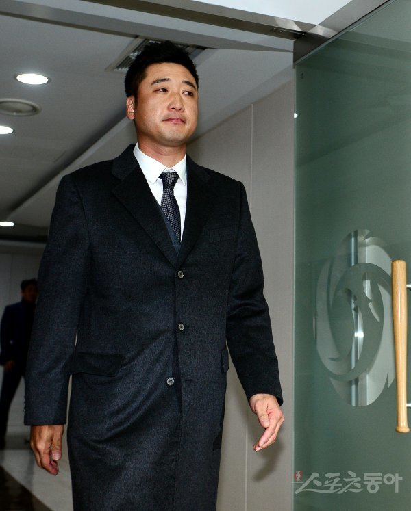 지난 2015년 문우람 폭행사건의 가해자로 지목된 히어로즈 이택근이 19일 서울 도곡동 KBO회관에서 열린 상벌위원회에 참석한 뒤 기자회견장으로 들어서고 있다.