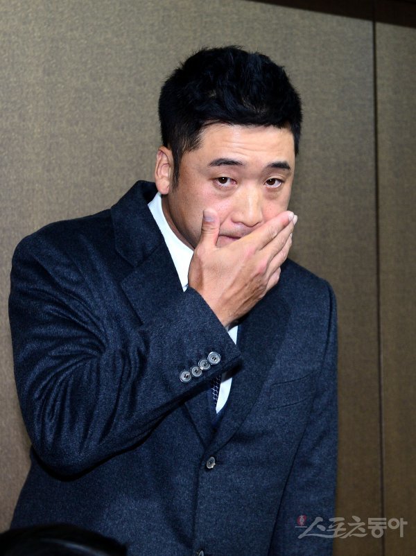 지난 2015년 문우람 폭행사건의 가해자로 지목된 히어로즈 이택근이 19일 서울 도곡동 KBO회관에서 열린 상벌위원회에 참석한 뒤 기자들을 향해 입장을 표명하고 있다.