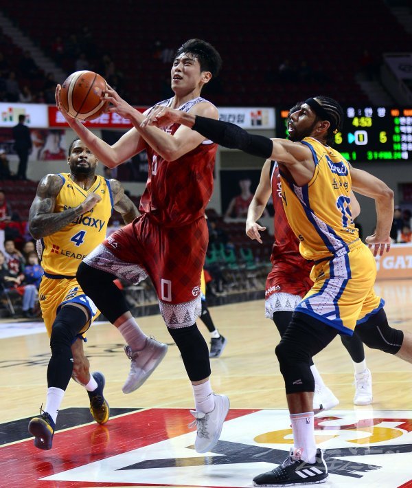 19일 안양실내체육관에서 열린 ‘2018-2019 SKT 5GX 프로농구’ 서울 삼성과 안양 KGC인삼공사 경기에서 KGC인삼공사 변준형이 삼성 문태영의 수비를 뚫고 골밑을 공격하고 있다.