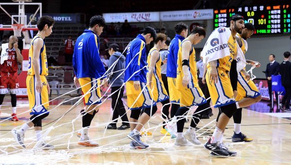 19일 안양실내체육관에서 열린 ‘2018-2019 SKT 5GX 프로농구’ 서울 삼성과 안양 KGC인삼공사 경기에서 78-101로 패하며 5연패에 빠진 삼성 선수들이 아쉬워하고 있다.