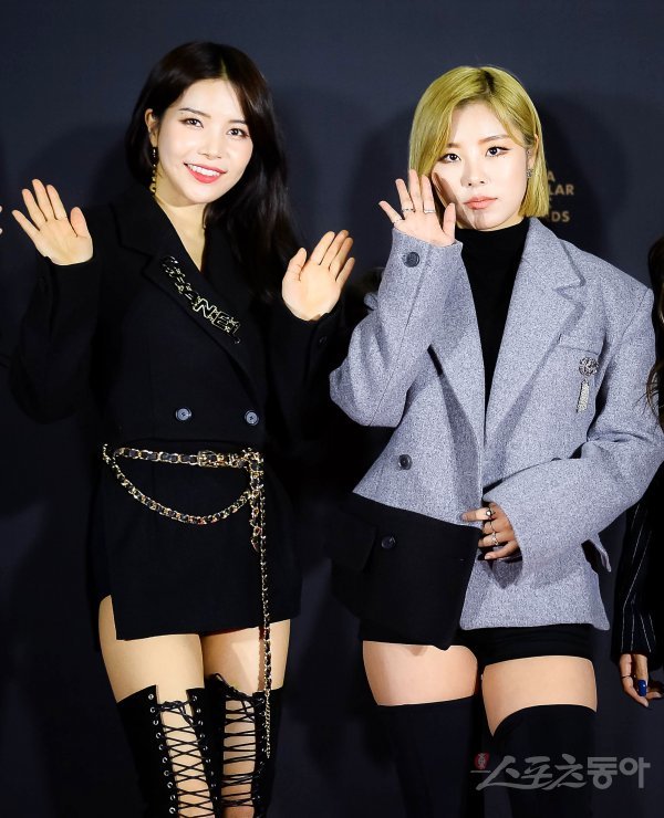 그룹 마마무의 솔라와 휘인(오른쪽)이 20일 경기도 고양시 일산 킨텍스에서 열린 ‘2018 대한민국대중음악시상식’(2018 KOREA POPULAR MUSIC AWARDS·이하 2018 KPMA) 레드카펫에 참석해 포토타임을 갖고 있다.
