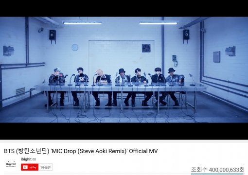 지난해 11월 공개한 ‘MIC Drop’ 리믹스 뮤직비디오는 23일 오전 11시 9분경 유튜브 조회수 4억건을 넘었다.