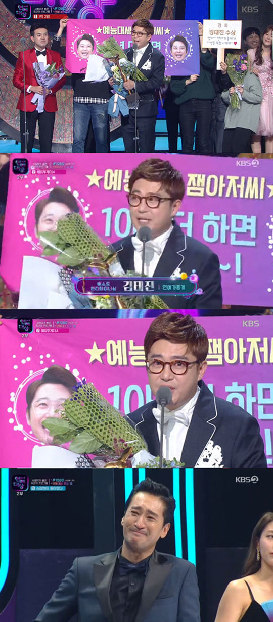 이날 김태진은 감동한 얼굴로 "잘 모르겠지만, 저도 매년 연예대상에 함께했다. 다만 여러분이 앉은 곳이 아닌 복도에서 수상자 인터뷰를 하기 위해 3~4시간을 있었다"고 말문을 열었다.