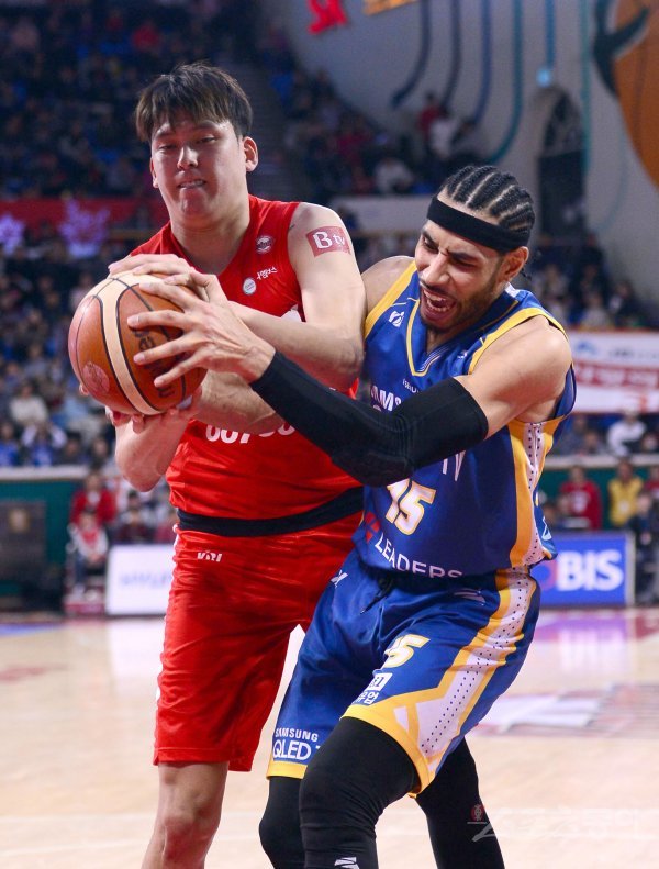 25일 잠실학생체육관에서 열린 ‘2018-2019 SKT 5GX 프로농구’ 서울 삼성과 서울 SK 경기에서 삼성 문태영이 SK 최준용이 리바운드 볼을 다투고 있다.
