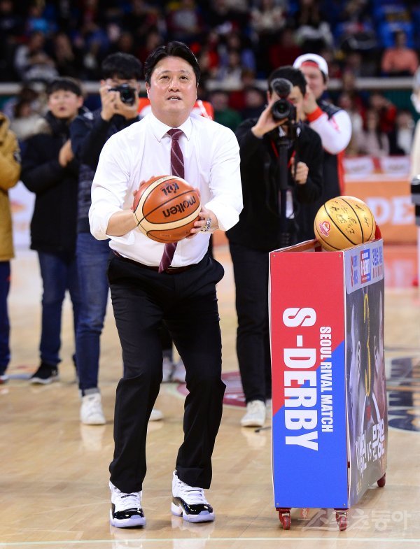 25일 잠실학생체육관에서 열린 ‘2018-2019 SKT 5GX 프로농구’ 서울 삼성과 서울 SK 경기 하프타임 때 메리 S마스 이벤트로 문경은 감독과 이상민 감독의 3점슛 대결이 진행되고 있다.