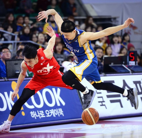 25일 잠실학생체육관에서 열린 ‘2018-2019 SKT 5GX 프로농구’ 서울 삼성과 서울 SK 경기에서 SK 변기훈과 삼성 이관희가 루즈볼을 다투고 있다.
