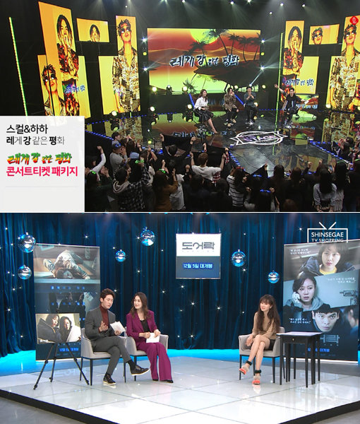 롯데홈쇼핑 ‘더 스테이지’의 레게 강 같은 평화 콘서트 티켓 방송(위쪽)과 공효진이 출연한 신세계TV쇼핑 영화 도어락 티켓 방송. 홈쇼핑 업계의 문화 콘텐츠 판매가 한창이다. 사진제공|롯데홈쇼핑·신세계TV쇼핑