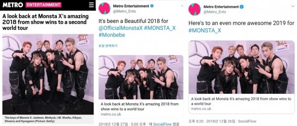 영국 유명 신문 <메트로>는 26일과 27일 (현지 시각) 공식 사이트와 공식 SNS를 통해“음악방송 1위에서 두 번째 월드 투어에 이르기까지 몬스타엑스의 놀라운 2018년을 돌아본다”라는 타이틀의 기획 기사를 통해 전세계를 무대로 눈부신 글로벌 활약을 펼치고 있는 몬스타엑스를 집중적으로 보도했다.