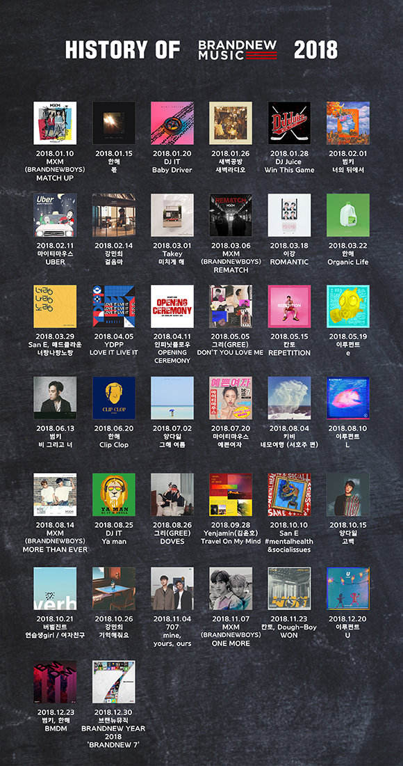 MXM의 미니앨범으로 시작했던 브랜뉴뮤직의 2018년은 바로 어제 발매된 연말 레이블 프로젝트 싱글 ‘브랜뉴이어 2018’로 마무리됐는데, 특히 이번 \'브랜뉴이어 2018\'은 \'BRANDNEW 7\'이란 부제 아래 버벌진트, 범키, 이루펀트, 양다일, 한해, MXM 등 브랜뉴뮤직의 개성 넘치는 아티스트들이 한데 모여 더욱 화제를 모으고 있다.
