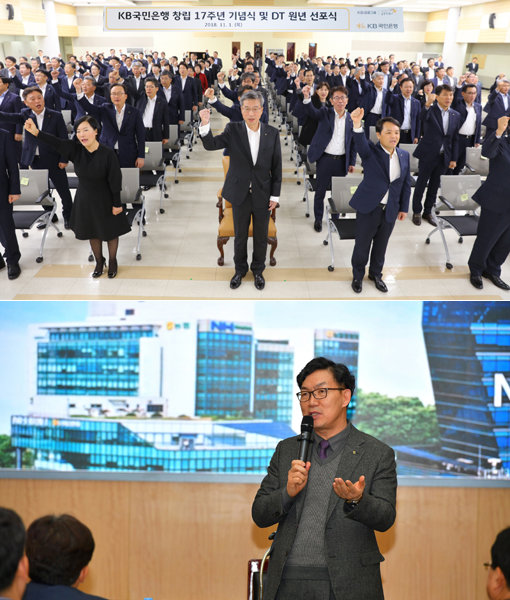 2019년 금융권은 우리금융지주 출범으로 금융 지주사 간 치열한 경쟁이 예상되는 가운데 세대교체, 성과주의, 디지털, 인수·합병을 승부수로 내걸었다. KB금융그룹 디지털혁신부문장을 맡은 허인(위쪽 사진 가운데) KB국민은행장과 2019년 경영전략 워크샵에서 발표 중인 이대훈 NH농협은행장. 사진제공|KB국민은행·NH농협