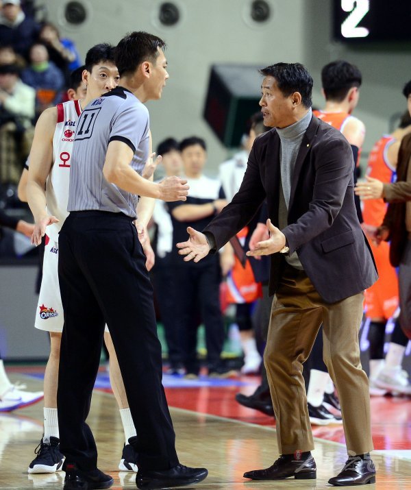 1일 인천삼산월드체육관에서 열린 ‘2018-2019 SKT 5GX 프로농구’ 고양 오리온과 인천 전자랜드 경기에서 오리온 추일승 감독이 심판 판정에 항의하고 있다.