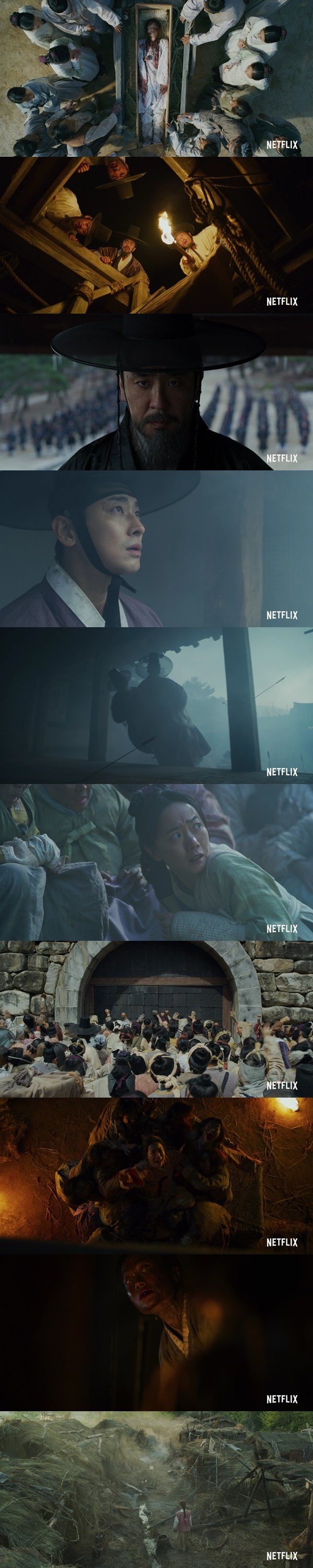 공개된 2차 예고편에서는 의문의 시신이 의녀 ‘서비’(배두나 분)가 일하는 지율헌에 도착하면서 곧 원인 모를 역병으로 쓰러진 백성들을 보여준다. 서비의 절박한 외침과 함께 정체를 알 수 없는 존재들인 괴물들이 굶주림에 허덕이며 공포에 휩싸인 백성들을 예고 없이 공격한다. 영의정 ‘조학주’(류승룡 분) 역시 권력을 위해 왕세자 ‘이창’(주지훈 분)을 병사들로 조여가며, 미스터리한 역병의 뒤에 숨어있는 거대한 음모에 대한 호기심도 한층 높여 역대급 볼거리와 스토리를 예고하고 있다.