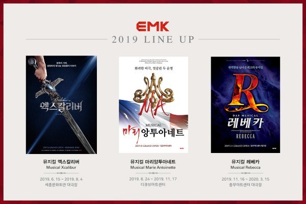 뮤지컬 ‘마타하리’와 뮤지컬 ‘웃는 남자’로 창작뮤지컬 계에 새로운 역사를 쓰고, 뮤지컬 ‘엘리자벳’과 ‘팬텀’으로 연말을 화려하게 수놓고 있는 EMK뮤지컬컴퍼니(이하 EMK)가 2019년 라인업을 발표했다. 창작뮤지컬을 잇달아 성공시키며 브랜드 가치와 신뢰를 쌓아 올린 EMK가 2019년 6월 세 번째 창작뮤지컬 ‘엑스칼리버’로 다시 한번 역대급 무대를 선보인다. 또한 한국 프로덕션이 재창작한 가장 완성도 높은 ‘마리 앙투아네트’와 완벽함을 넘어선 최고의 뮤지컬 ‘레베카’가 다시 돌아와 2019년 하반기를 풍성하게 장식할 예정이다.