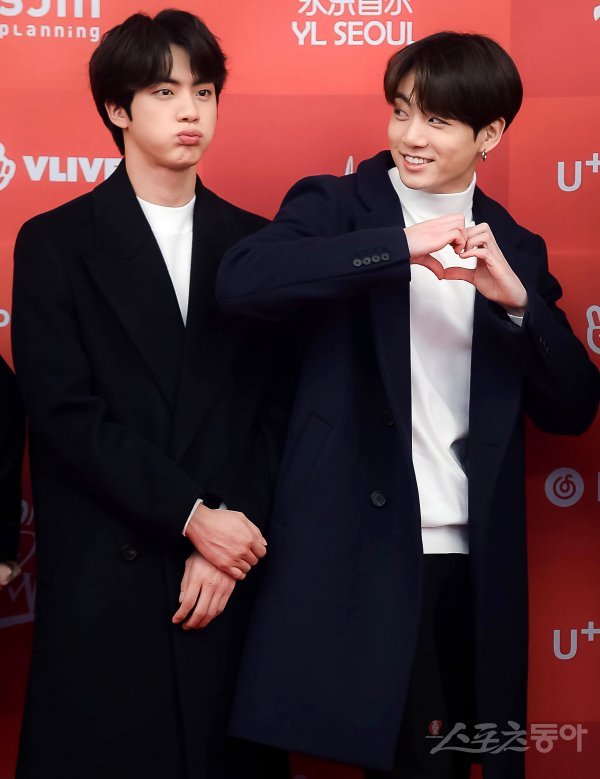 방탄소년단 진과 정국(오른쪽)이 6일 서울 구로구 고척스카이돔에서 열린 ‘제33회 골든디스크어워즈’ 음반 부문 시상식을 앞두고 열린 포토월에서 포즈를 취하고 있다.