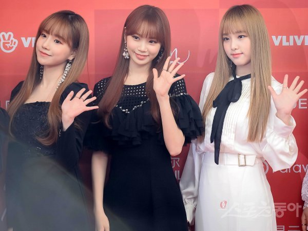 아이즈원의 조유리와 김채원, 최예나(왼쪽부터)가 6일 서울 구로구 고척스카이돔에서 열린 ‘제33회 골든디스크어워즈’ 음반 부문 시상식을 앞두고 열린 포토월에서 포즈를 취하고 있다.