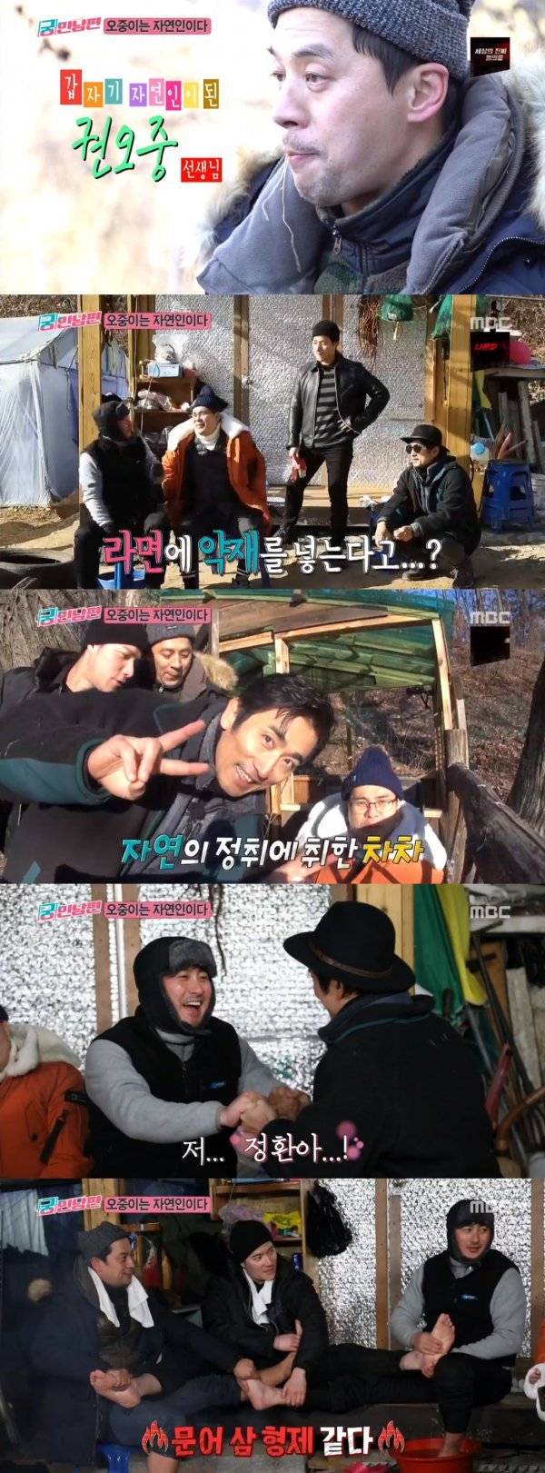 바다낚시에 이어 ‘오중이는 자연인이다’의 아이템을 직접 기획한 권오중은 자신이 꿈꿔왔던 자연 친화적인 삶에 잔뜩 들뜬 모습을 보였다. 특히 라면부터 오골계 백숙까지 모든 요리에 자연인이 직접 채취한 각종 약초를 투입, 멤버들의 원성에도 아랑곳하지 않는 약초 사랑을 보여 폭소케 만들었다.