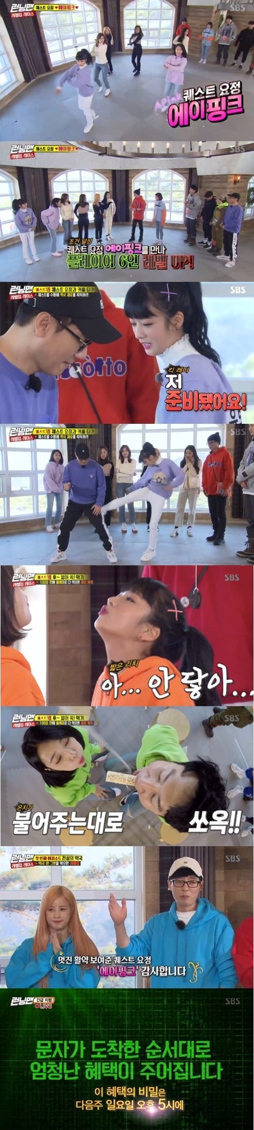 멤버들은 레벨을 상승시키기 위해 각 장소에 숨겨져 있는 퀘스트를 찾아 다녔고, 그러던 중 ‘퀘스트 요정’ 에이핑크를 만났다. ‘완전체’로 ‘런닝맨’에 첫 출격한 에이핑크는 멤버들과 짝을 이뤄 존재감을 한껏 드러내며 웃음 폭탄을 선사했고, 보미는 오랜만에 만난 지석진에게 변함없는 로우킥까지 선보였다.