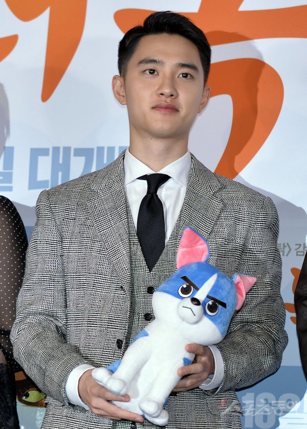 7일 서울 용산 CGV에서 열린 영화 ‘언더독’ 언론시사회에 참석한 도경수가 뭉치 인형과 함께 카메라를 향해 포즈를 취하고 있다.