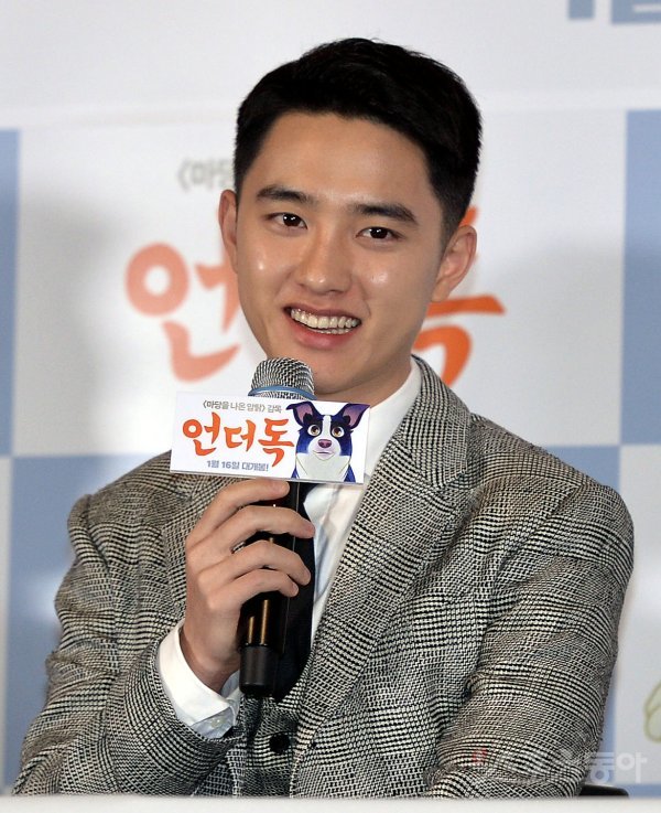 7일 서울 용산 CGV에서 열린 영화 ‘언더독’ 언론시사회에 참석한 도경수가 오성윤 감독의 건강 질문에 답하고 있다.