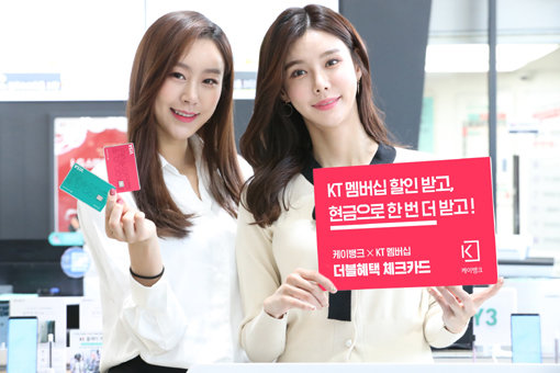 케이뱅크가 주요주주사인 KT와 손잡고 ‘케이뱅크×KT멤버십 더블혜택 체크카드’(사진)를 내놓았다. KT멤버십 제휴가맹점에서 결제하면 멤버십 포인트 할인적용을 받는다. 전월 체크카드 이용실적이 20만원 이상이면 최대 월 4만원 캐시백 혜택을 누릴 수 있다. 이 카드로 KT 통신요금을 자동이체하면 전월 사용실적에 따라 월 5∼20%, 최대 2만원까지 캐시백을 제공한다.