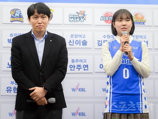 왕조의 품에 안긴 박지현은 “가장 첫 번째로 뽑히게 돼 영광으로 생각한다. 이 자리에 설 수 있게 도와주신 숭의여고 최철권 부장님과 이호근 감독님 그리고 부모님께 감사드린다”고 인사를 전한 뒤 “우리은행은 유독 팀 훈련량이 많은 팀이라고 알고 있다. 그저 위성우 감독님을 믿고 따르면서 하루빨리 팀에 적응하겠다”고 소감을 밝혔다.