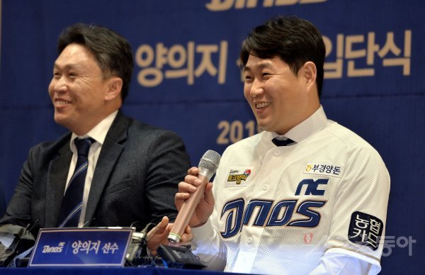 8일 경남 창원시 사보이호텔에서 ‘양의지 NC 입단식’이 열렸다. NC에 입단한 양의지가 입단 소감을 밝히고 있다.