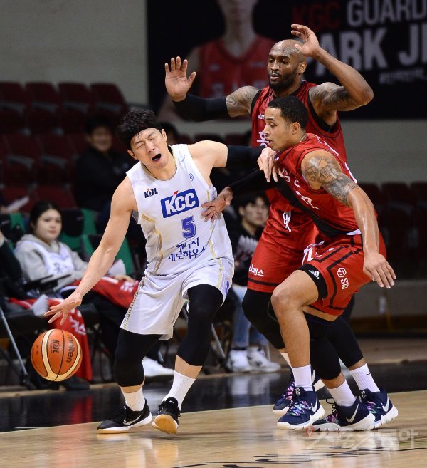 8일 안양실내체육관에서 열린 ‘2018-2019 SKT 5GX 프로농구’ 전주 KCC와 안양 KGC인삼공사 경기에서 KCC 이정현이 KGC 테리와 에드워즈의 더블수비에 막혀 고전하고 있다.