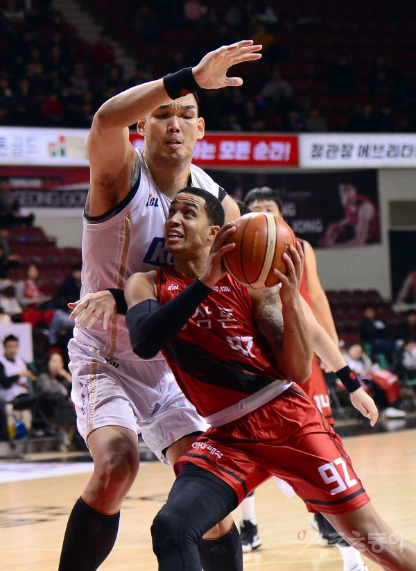 8일 안양실내체육관에서 열린 ‘2018-2019 SKT 5GX 프로농구’ 전주 KCC와 안양 KGC인삼공사 경기에서 KGC 에드워즈가 KCC 하승진의 수비를 뚫고 골밑을 공격하고 있다.