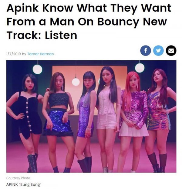 빌보드는 지난 7일(현지 시간) 공식 홈페이지를 통해 ‘에이핑크, 화려한 신곡의 남자에게서 그들이 원하는 것을 알다(Apink Know What They Want From a Man On Bouncy New Track: Listen)’라는 제목의 기사를 게재했다.
