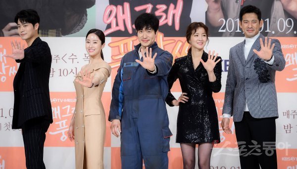 9일 서울 영등포 타임스퀘어 내 아모리스 홀에서 열린 KBS 2TV 새 수목드라마 ‘왜그래 풍상씨’ 제작발표회에 출연 배우들이 참석해 포토타임을 갖고 있다. 왼쪽부터 배우 이창엽, 전혜빈, 유준상, 이시영, 오지호.