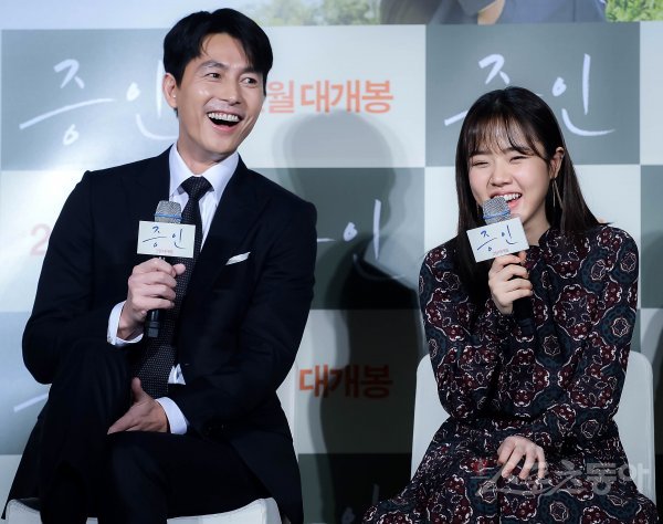 배우 정우성과 김향기(오른쪽)가 10일 서울 광진구 롯데시네마 건대입구에서 열린 영화 ‘증인’ 제작보고회에 참석해 환하게 웃고 있다.