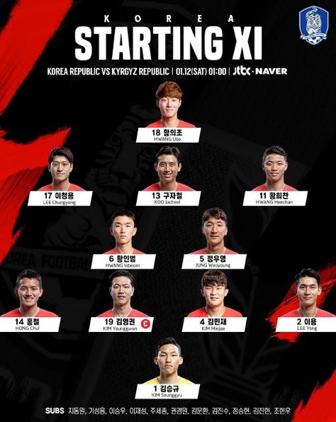 이날 한국은 4-2-3-1 포메이션으로 키르기스스탄을 상대한다. 원 톱에 황의조가 나서고 2선은 이청용, 구자철, 황희찬이 나선다.