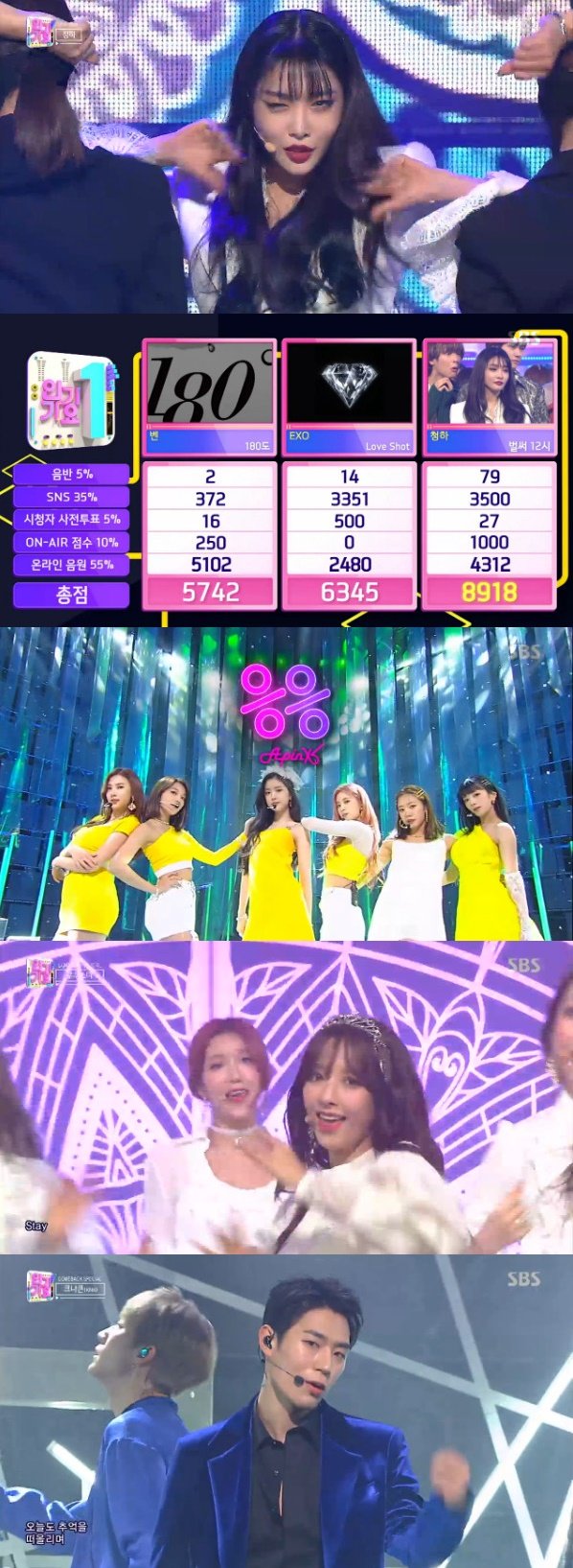 가수 청하가 SBS '인기가요'에서 1위를 차지, 음악방송에서 4관왕을 했다.