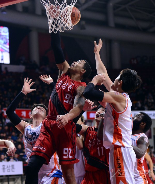 13일 안양실내체육관에서 열린 ‘2018-2019 SKT 5GX 프로농구’ 인천전자랜드와 안양 KGC 경기에서 KGC 에드워즈와 전자랜드 강상재가 리바운드 볼을 다투고 있다.