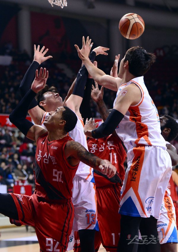 13일 안양실내체육관에서 열린 ‘2018-2019 SKT 5GX 프로농구’ 인천전자랜드와 안양 KGC 경기에서 KGC 에드워즈와 전자랜드 강상재가 리바운드 볼을 다투고 있다.