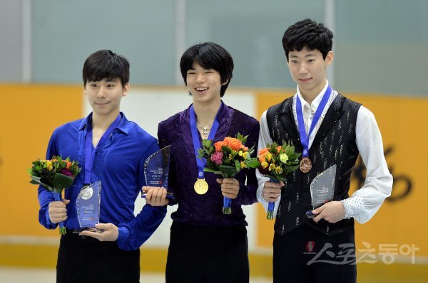 13일 서울 목동실내빙상장에서 열린 ‘제 73회 전국남녀 피겨스케이팅 종합 선수권대회’ 남자 싱글 프리스케이팅에 2위 이준형, 1위 차준환, 3위 이시형이 기념촬영을 하고 있다.