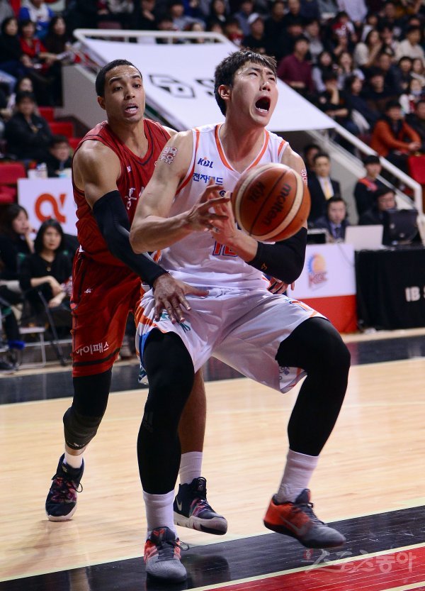 13일 안양실내체육관에서 열린 ‘2018-2019 SKT 5GX 프로농구’ 인천전자랜드와 안양 KGC 경기에서 전자랜드 정효근이 KGC 에드워즈의 파울에 볼을 놓치고 있다.
