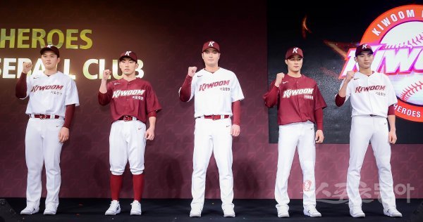 15일 서울 종로구 당주동 포시즌스 호텔 그랜드 볼룸에서 키움 히어로즈의 출범식이 열렸다. 키움히어로즈 최원태, 서건창, 박병호, 김하성, 이정후(왼쪽부터)가 새로운 디자인의 유니폼을 공개하고 있다. 김진환 기자 kwangshin00@donga.com
