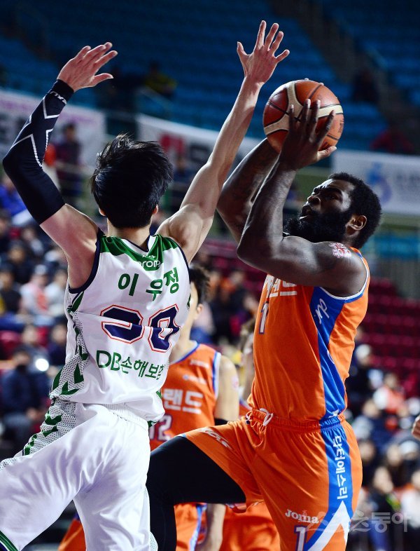 15일 인천 삼산월드체육관에서 열린 ‘2018-2019 SKT 5GX 프로농구’ 인천 전자랜드와 원주 DB의 경기에서 전자랜드 팟츠가 DB 이우정의 수비를 피해 슛을 쏘고 있다.
