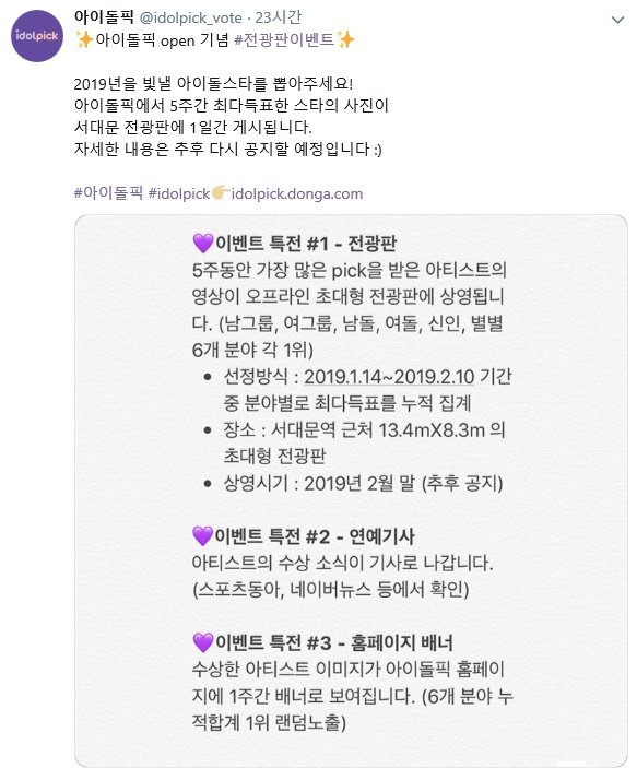 아이돌픽 측은 공식 SNS에 "2019년을 빛낼 아이돌 스타를 뽑아주세요"라는 글과 함께 전광판 이벤트와 관련된 소식을 전했다.