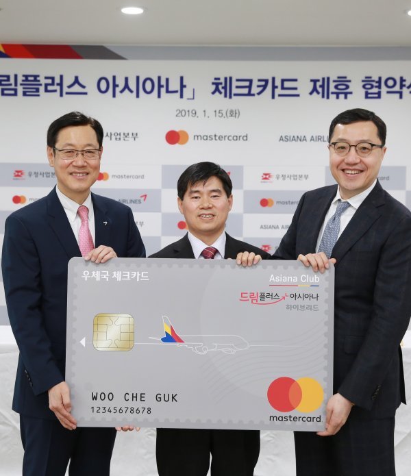 아시아나항공은 15일 광화문 서울중앙우체국에서 ‘드림플러스 아시아나 체크카드’ 출시 업무협약식을 가졌다. 협약식에는 아시아나항공 김영헌 여객본부장, 우정사업본부 신대섭 예금사업단장, 마스터카드코리아 최동천 대표가 참석했다.