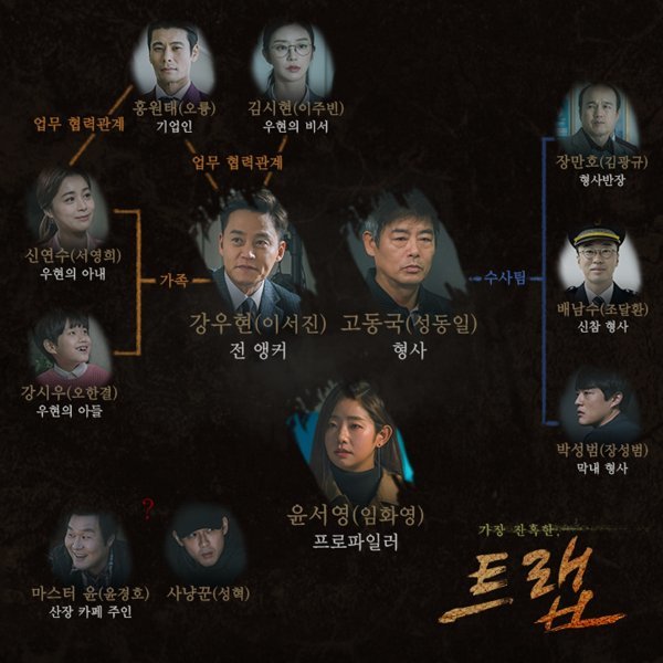 16일 공개된 인물관계도는 ‘트랩’의 주요 캐릭터와 이들의 관계성을 한눈에 보여주는 것뿐만 아니라, 탄탄한 조연 배우 라인업을 소개하고 있다. 독보적인 존재감을 가진 연기파 배우 서영희, 김광규, 오륭, 윤경호, 조달환, 성혁, 이주빈, 장성범, 그리고 아역 배우 오한결은 사건의 전말을 파헤치는 이서진, 성동일, 임화영과 연기 호흡을 맞추며 완벽한 시너지를 선보일 전망이다.
