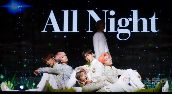 그룹 아스트로(ASTRO)가 16일 서울 강남구 삼성동 코엑스 아티움에서 열린 첫 정규 앨범 ‘All Light(올라잇)’ 발매 쇼케이스에서 열정적인 무대를 펼치고 있다.